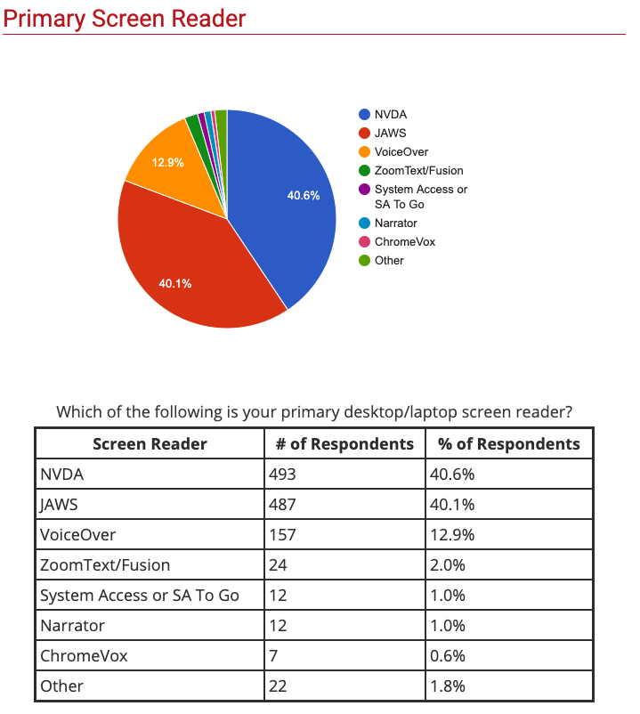 많은 이용자가 무려 93.6%의 스크린 리더 사용자가 NVDA, JAWS 그리고 VoiceOver에 몰려있는 모습을 볼 수 있다. 2000년대 부터 JAWS가 독점하던 스크린 리더 시장을 다른 스크린 리더들이 따라 잡고 있다.